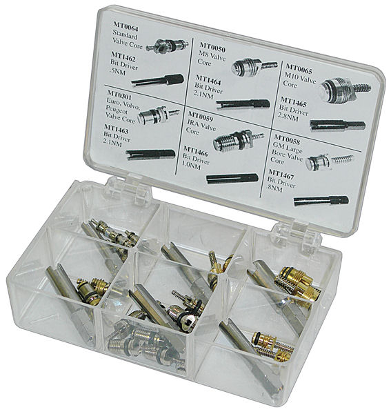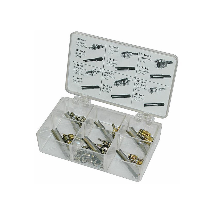 Súprava ventilov a náradie na údržbu autoklimatizácie.
